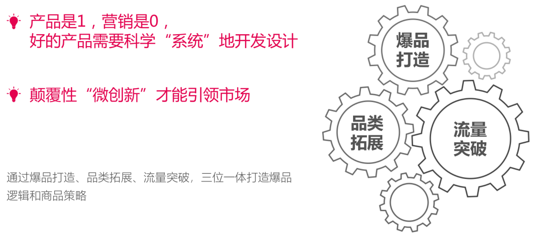 產(chǎn)品塑造的核心,是對(duì)用戶的洞察創(chuàng)造,從單純的占領(lǐng)“產(chǎn)品品類”轉(zhuǎn)向經(jīng)營(yíng)“年輕人和產(chǎn)品”,最終營(yíng)銷一種“品牌綜合體驗(yàn)”或“生活方式”??梢酝ㄟ^(guò)爆品打造、品類拓展、流量突破,三位一體打造爆品邏輯和商品策略。
